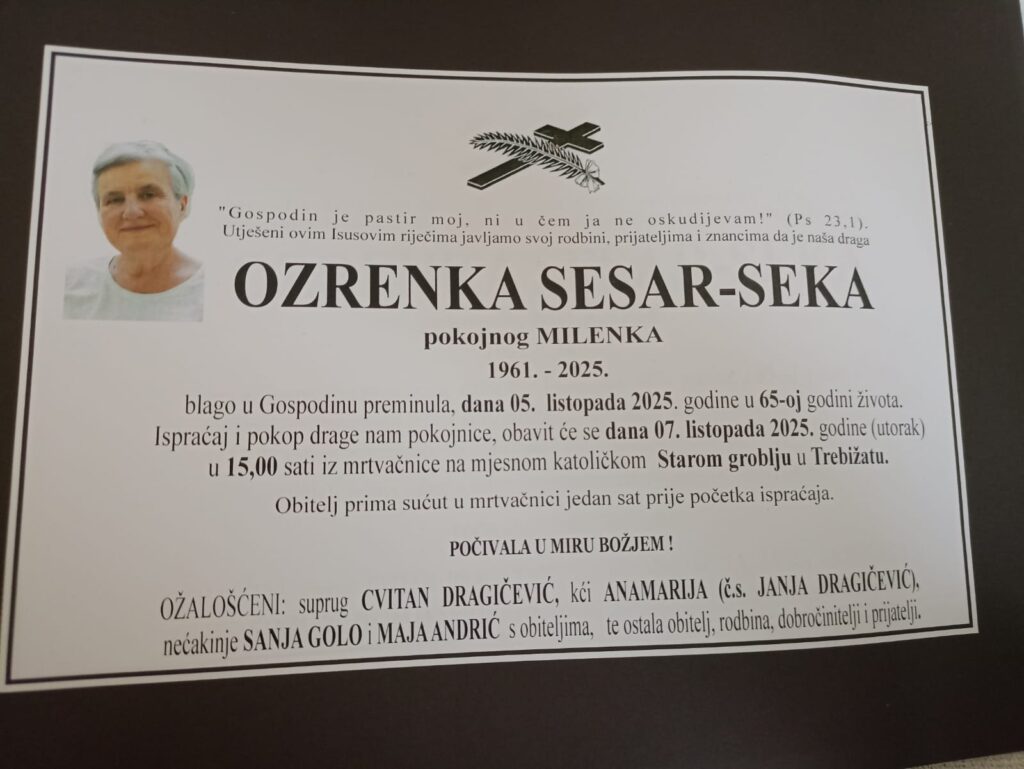 Preminula Ozrenka Sesar, majka s. M. Janje Dragičević Autor objave:Klarise Brestovsko Objava objavljena:6 listopada, 2025 Kategorija objave:Novosti Možda nešto kao Hodočasnici iz župe Lug-Brankovići 14 rujna, 2025 Misa zahvalnica za proteklu godinu 2 siječnja, 2025 Misionarke ljubavi iz Banja Luke 31 listopada, 2022